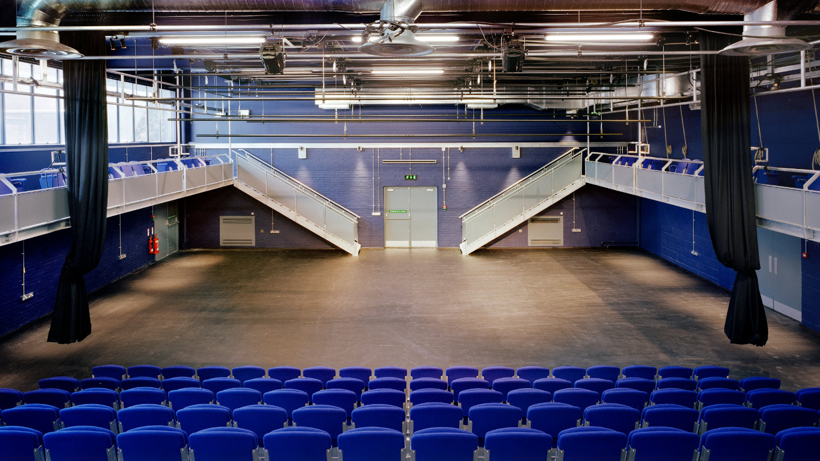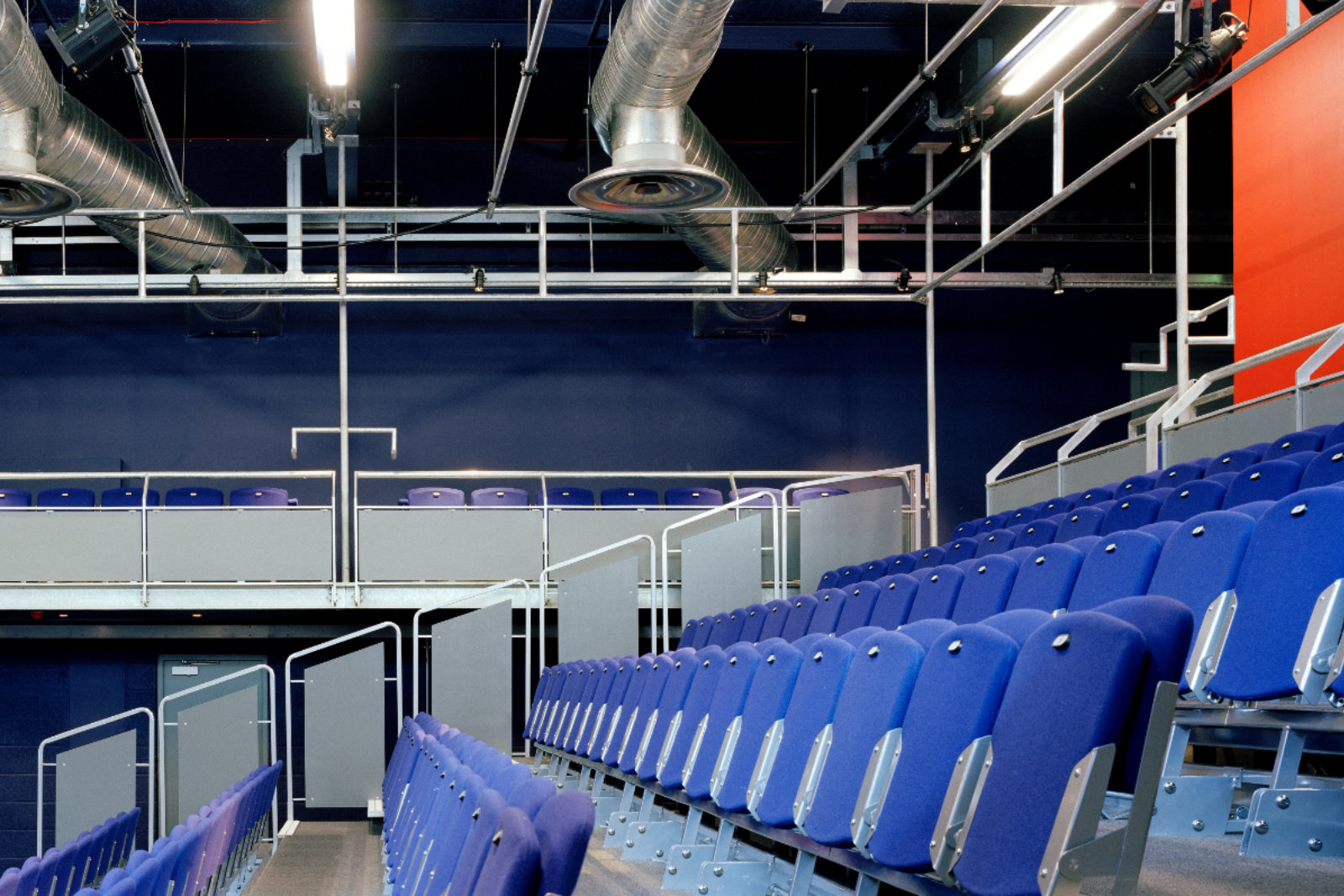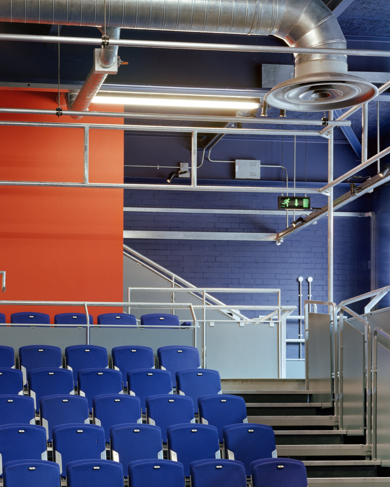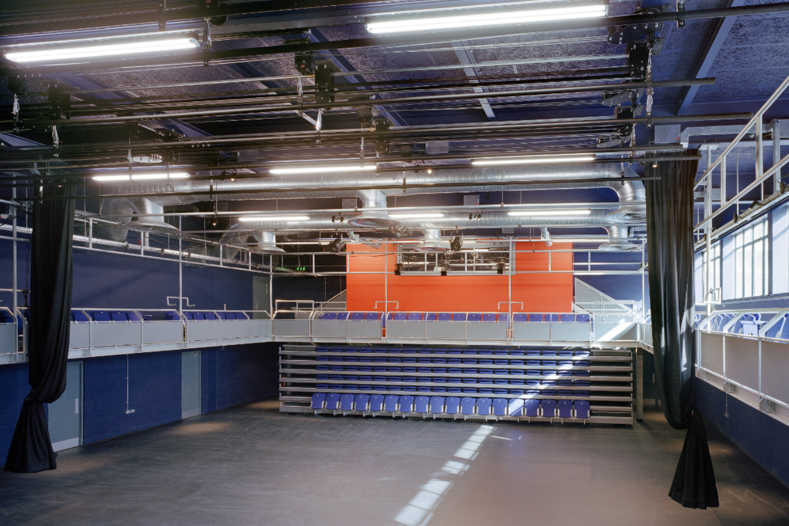The new space is formed by the insertion of a suspended steel balcony around three sides of the room, with integral access stairs and a technical control room. Seating consists of a single row of seats around the balcony and a retractable bleacher seating unit, giving a capacity of 216 in the end stage layout. Moveable seating units on the flat floor will allow three and four sided layouts to be achieved with a capacity of up to 300. The motorised bleacher can be retracted to allow the entire floor area to be used for teaching, workshops and other events. Technical installations are extremely simple but provide a basic infrastructure to which additional equipment can be added later, as funds allow. All steelwork is galvanised with the use of bright colour to create a ‘studio’ feel and a sense of animation to the new theatre.