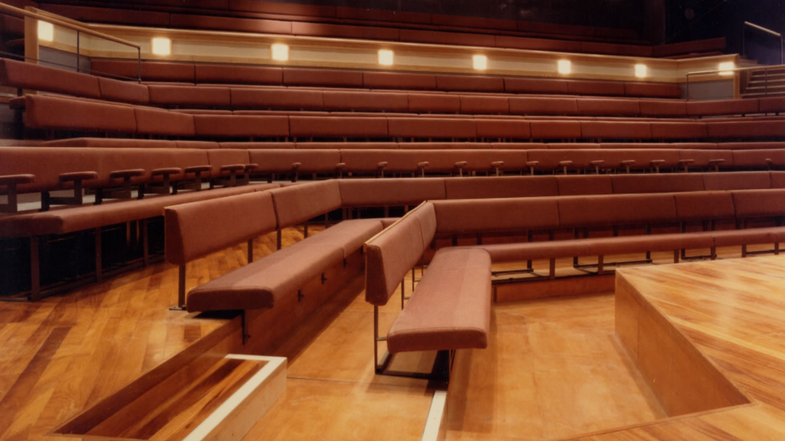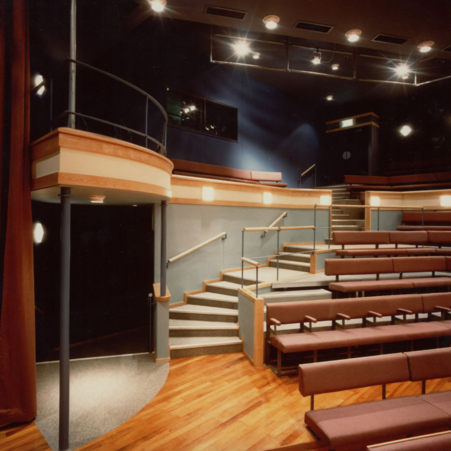 A flexible theatre was formed within an existing rectangular school hall to create a comfortable and well-equipped auditorium. It can also be adapted for uses requiring a flat floor, such as dinners and other social events. The 280-seat open stage auditorium is set on the short axis of the room and consists of a permanent raised gallery which wraps around the apron stage, with a new foyer space below. This is combined with a removable seating system on rostra, which can be cleared to create a large area of flat floor.