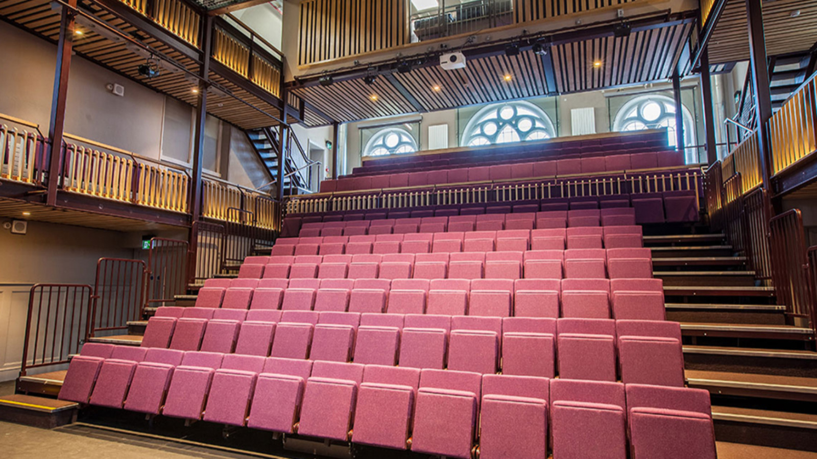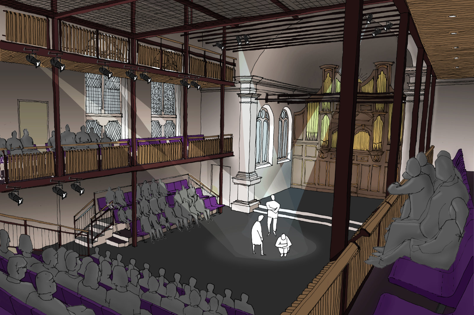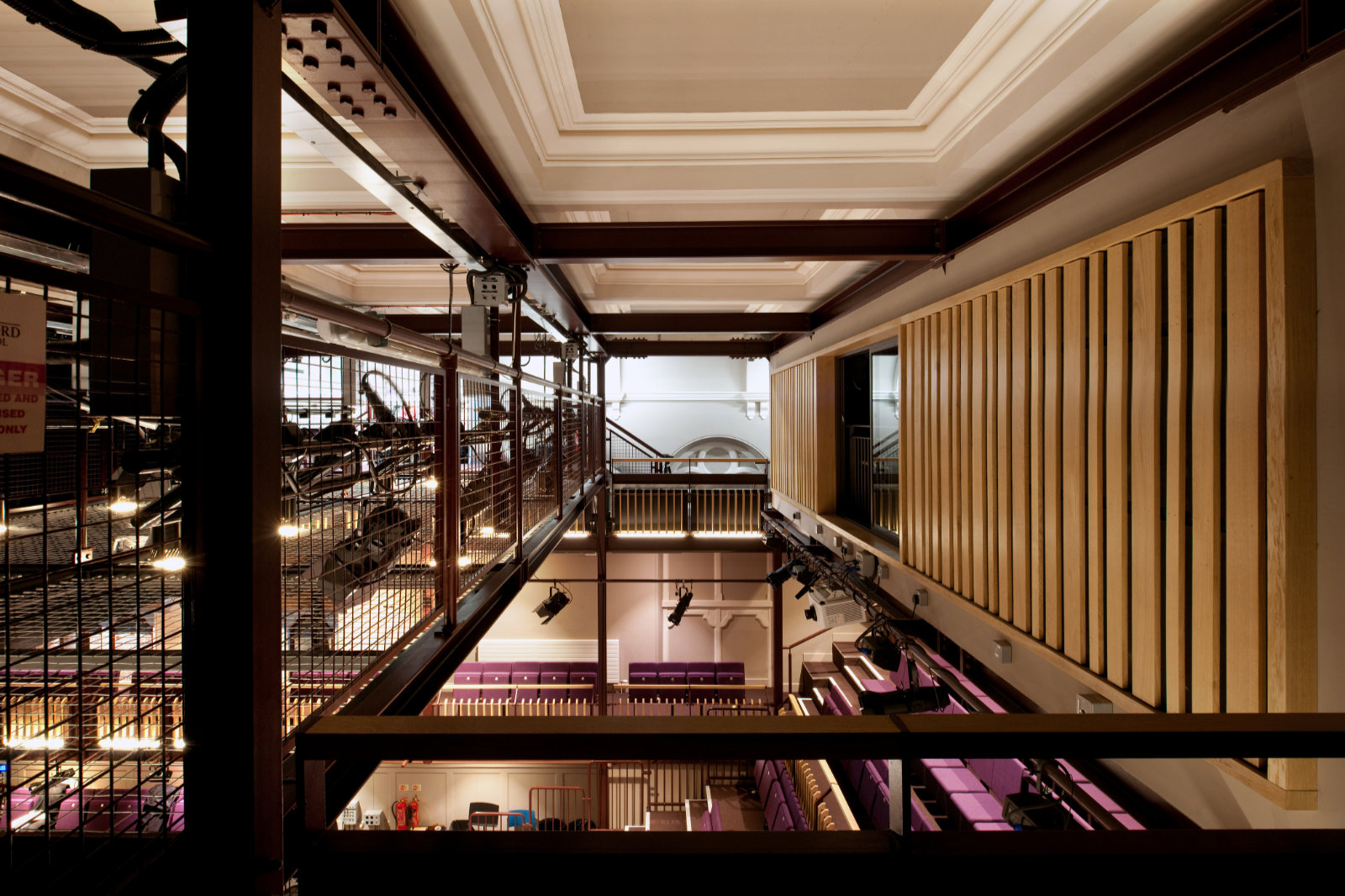 The theatre has been created by inserting a galleried structure into the original church space. The Minister’s House was restored to provide front of house facilities, offices and a studio, with the addition of a new foyer and backstage extension at the rear. The new foyer wraps around the semi-circular wall to the original chancel and a curved wall of glass provides views over the secluded gardens of the old churchyard.