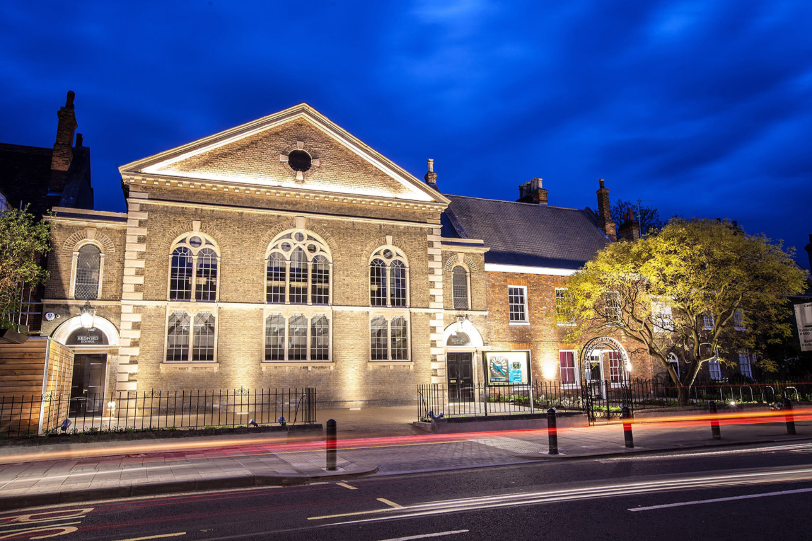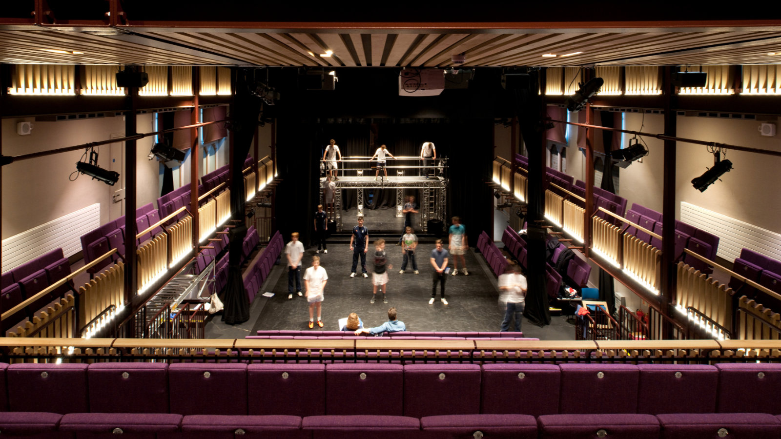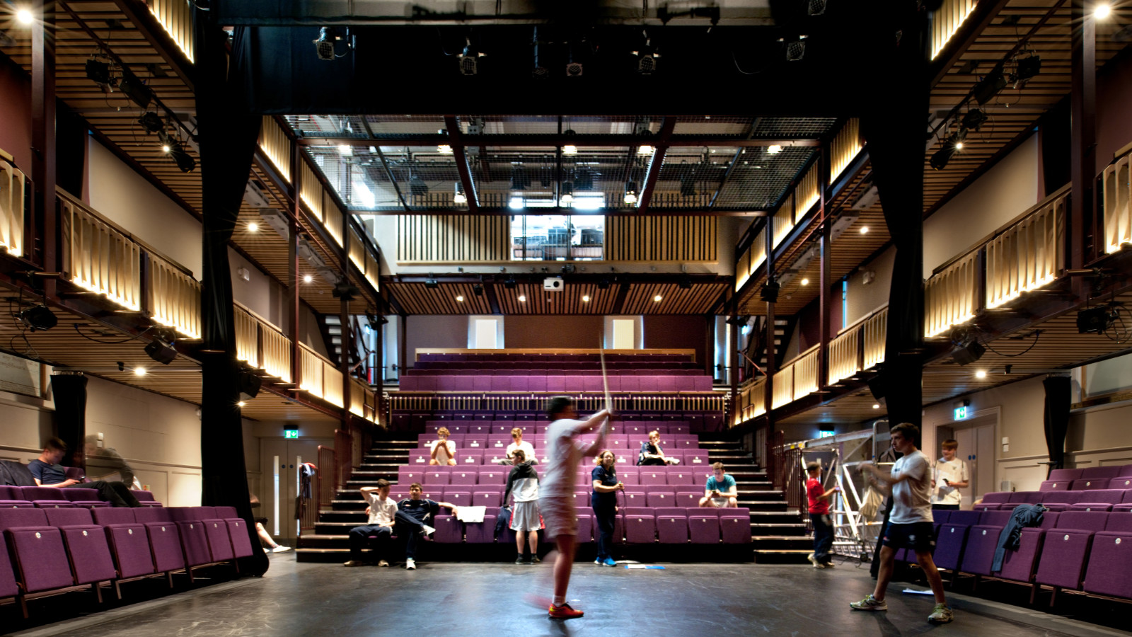 The theatre has been created by inserting a galleried structure into the original church space. The Minister’s House was restored to provide front of house facilities, offices and a studio, with the addition of a new foyer and backstage extension at the rear. The new foyer wraps around the semi-circular wall to the original chancel and a curved wall of glass provides views over the secluded gardens of the old churchyard.